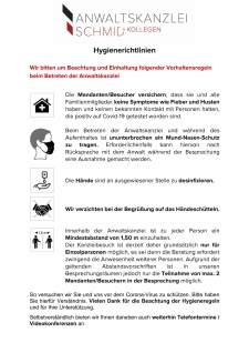 Wir bitten um Beachtung und Einhaltung folgender Verhaltensregeln beim Betreten der Anwaltskanzlei